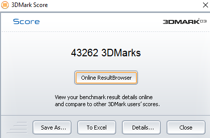 | 3DMark 03 Standard | 43262 points | |