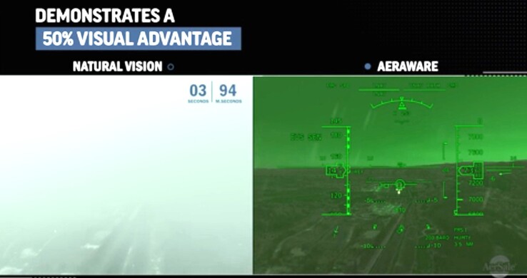 AerAware 系统由安装在飞机前部的 EVS-5000 摄像头组成。EVS-5000 可通过 4 个摄像头和 6 个传感器在可见光和红外光范围内观察低能见度飞行条件。飞行员在 SkyLens 头戴式显示器上看到的是一个混合现实视图,从一侧到另一侧完全覆盖 180 度。
