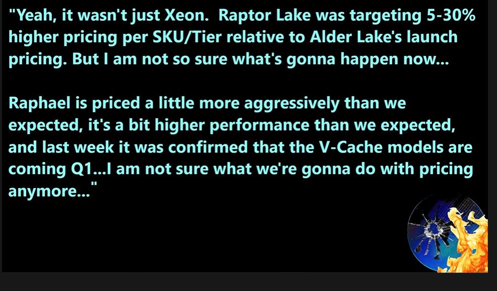 AMD Zen 4的性能和定价结构显然让英特尔措手不及,因为同一消息来源称,该公司的 Ryzen 7000 CPUs性能更好一些,而且AMD对它们的定价比英特尔预期的 "更积极一些"。