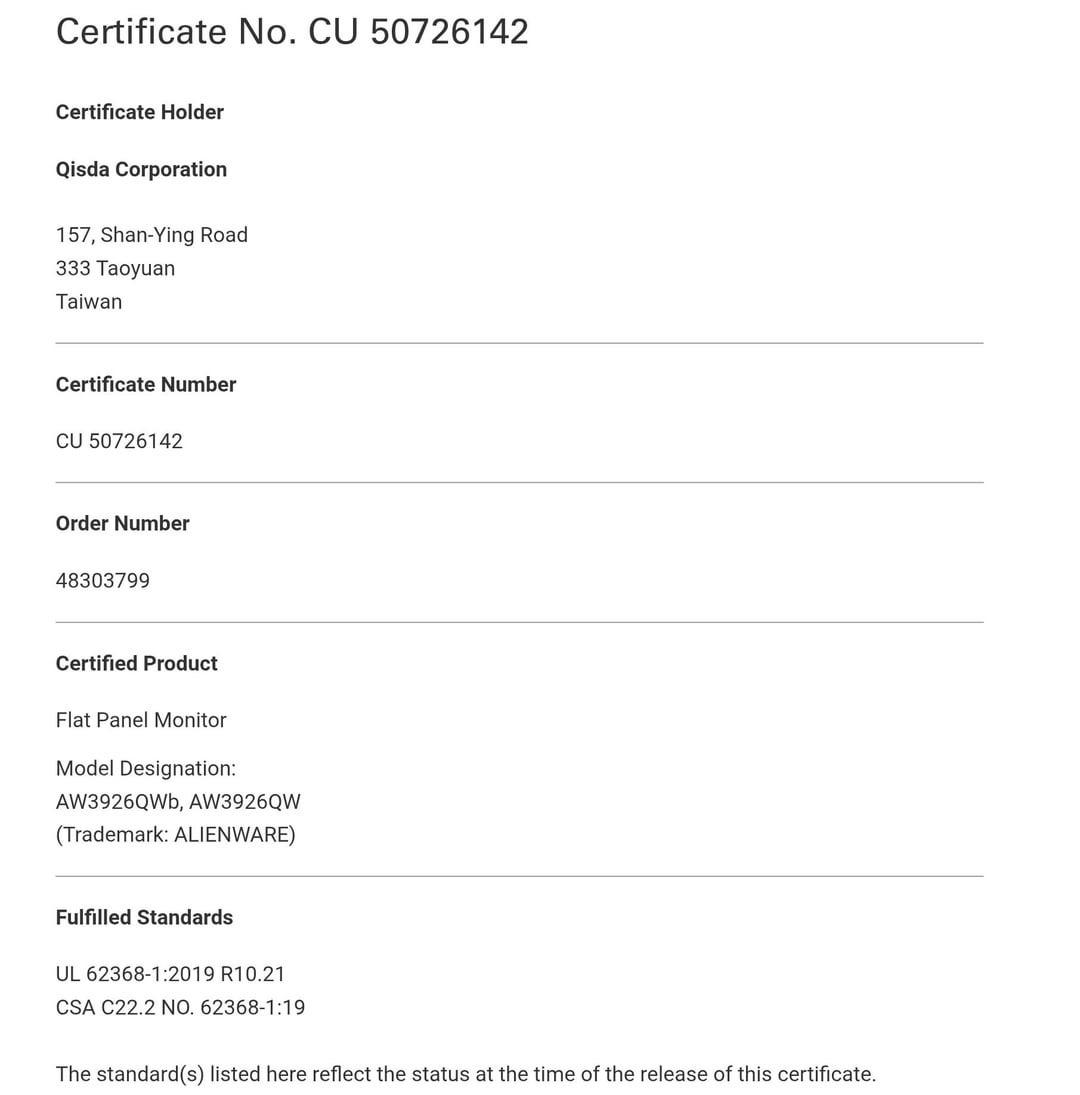 具体来说,最近的德国莱茵 TÜV 认证显示,戴尔已开发出一款新的 Alienware 显示器,型号为 AW3926QW。根据 Alienware 的命名方案,AW3926QW 是一款 39 英寸显示器。从这个意义上说,AW3926QW 将比 AW3425DWAW3425DW大得多。