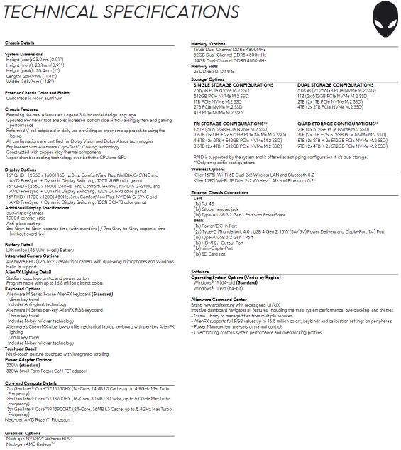 在显示器方面,用户可以选择三种不同的面板。有一个16英寸的QHD+(2560x1600)面板,刷新率为165HZ,另一个QHD+屏幕的刷新率为240HZ,还有一个FHD+显示器的刷新率为480HZ。所有三个显示器的峰值亮度为300 nit,对比度为1000:1,响应时间为3 ms。它们还拥有100%的sRGB或DCI-P3色域覆盖率、Nvidia G-SYNC、AMD FreeSync,以及戴尔的ComfortView Plus蓝光降低技术。