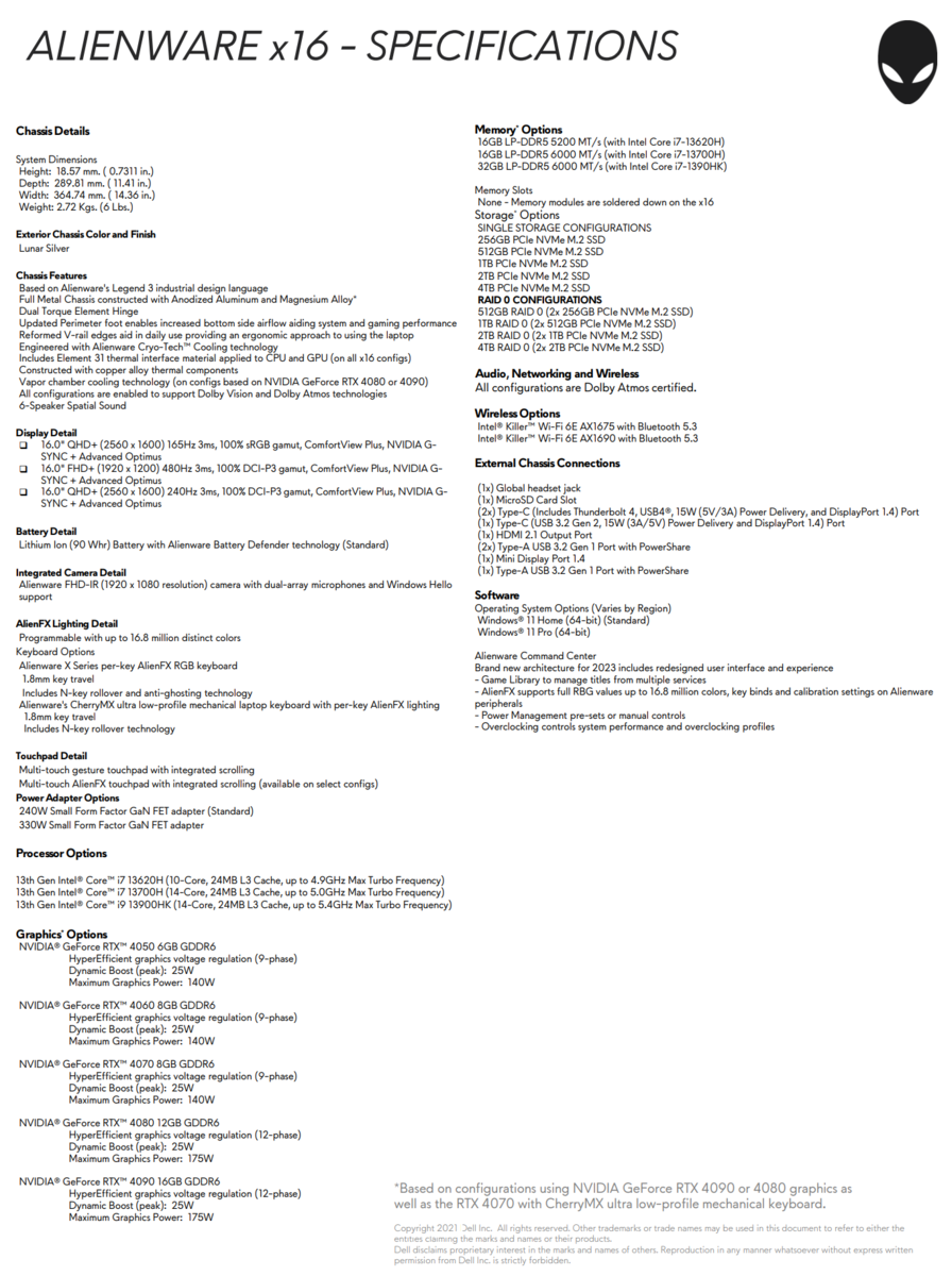网络需求由英特尔杀手Wi-Fi 6E AX1675或AX1690无线网卡和蓝牙5.3处理。所有Alienware x16型号都经过杜比全景声认证。