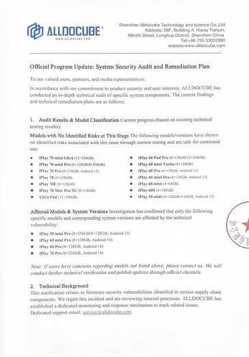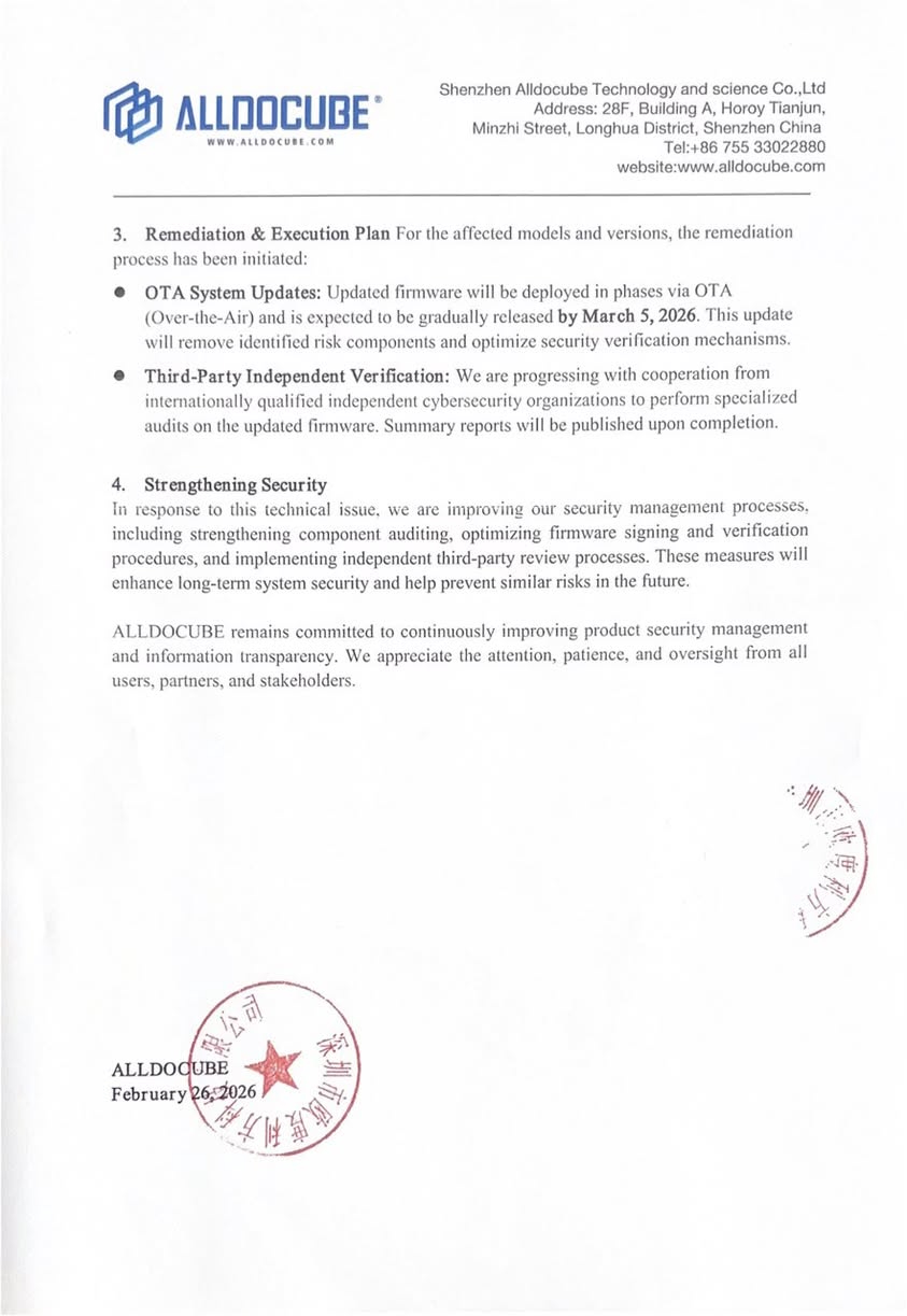 根据 Alldocube 的调查,没有任何直接危险的设备可以在上述文件中找到。Alldocube 承诺在 2026 年 3 月 5 日前对受影响的设备进行 OTA 固件更新,并将组织第三方审计,以确保更新固件的安全标准。