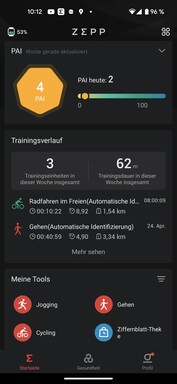 除了设置之外,所有收集的数据和健康功能都通过Zepp应用程序运行。所有的健康数据都以图标的形式显示在应用程序的主页上。这些图标将最重要的信息一目了然。点击一个图标可以打开相应的区域并显示进一步的信息。