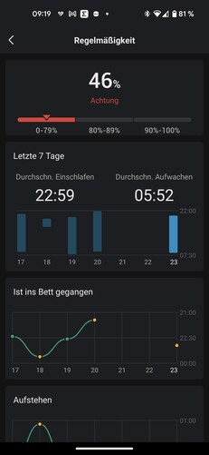 该软件不仅提供这些数据,而且还对其进行组织。这是用颜色代码和描述来完成的,如 "正常 "或 "注意"。除了睡眠阶段,该手表还收集了有关用户睡眠时的心率、呼吸质量和呼吸速率的信息。