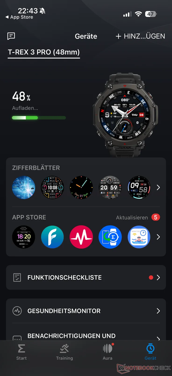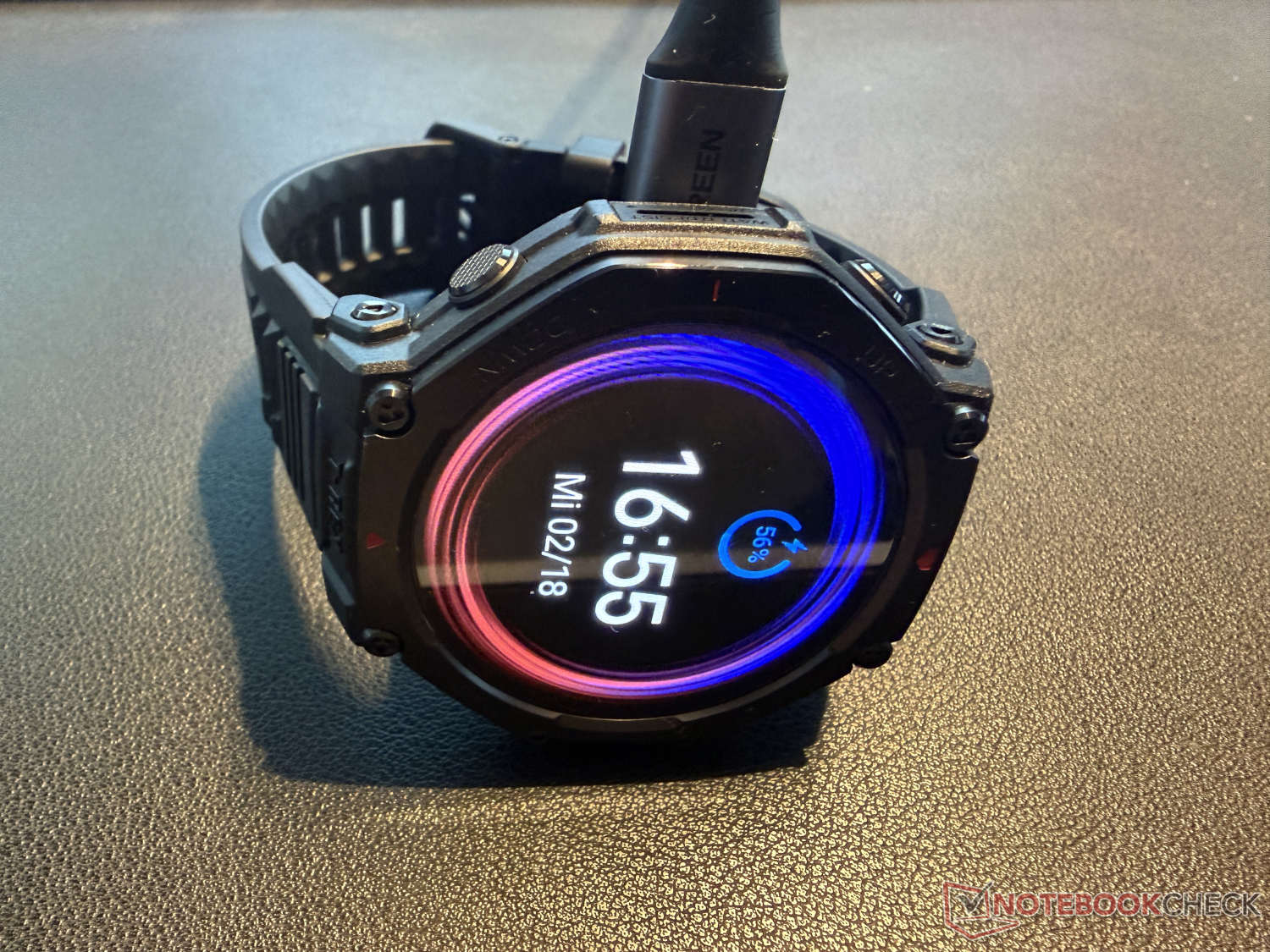 随着户外活动的增加,电池续航时间会相应减少,但正常使用情况下至少可以续航一周。因此,Amazfit T-Rex 3 Pro 相当耐用,偶尔才需要充电休息。为此,我们使用了随附的充电适配器,该适配器通过磁力吸附在智能手表的背面。半小时后,电量已达到 50%。从 0 到 100% 的整个充电过程在 90 分钟内完成。