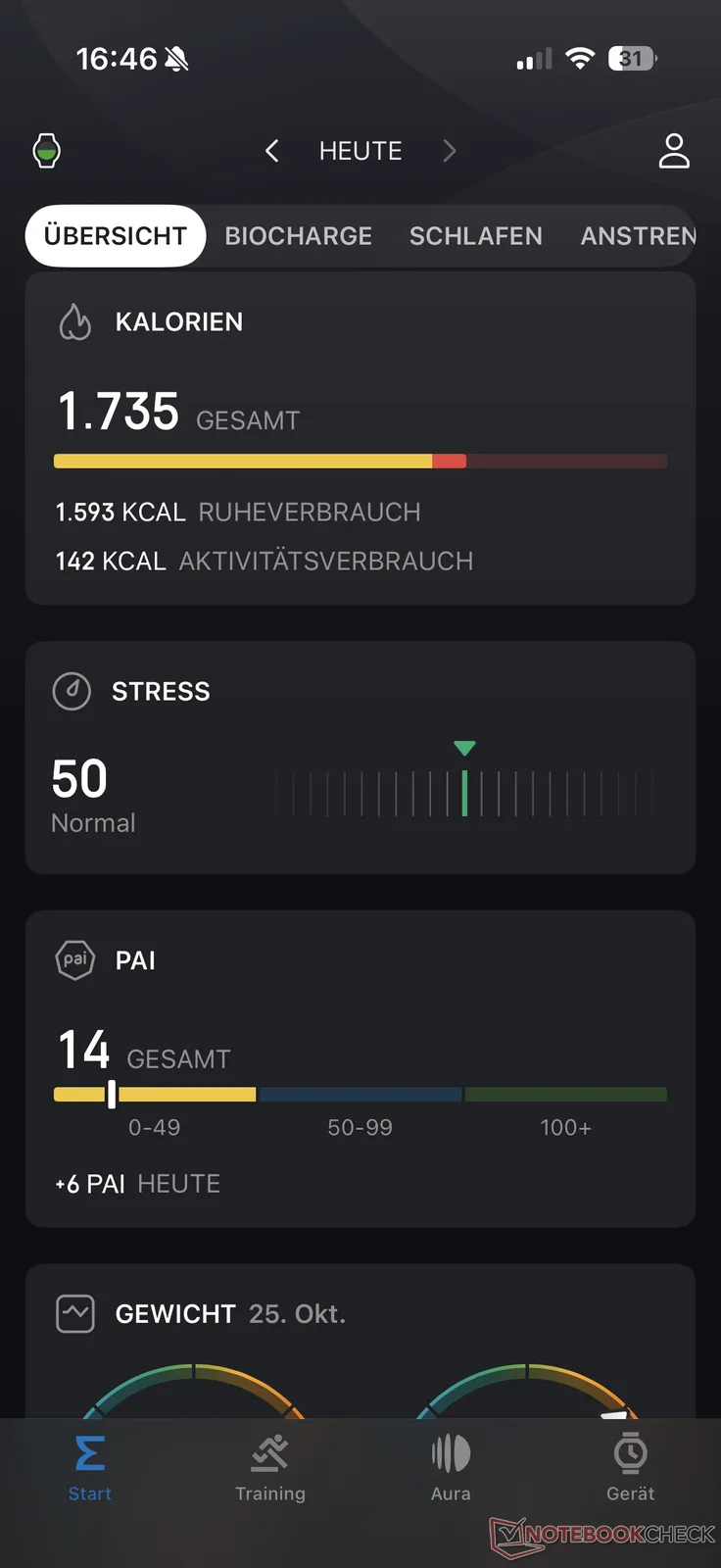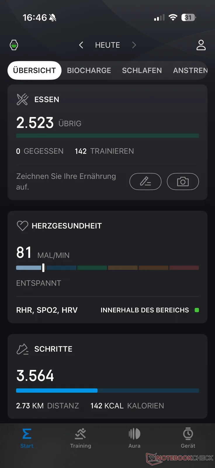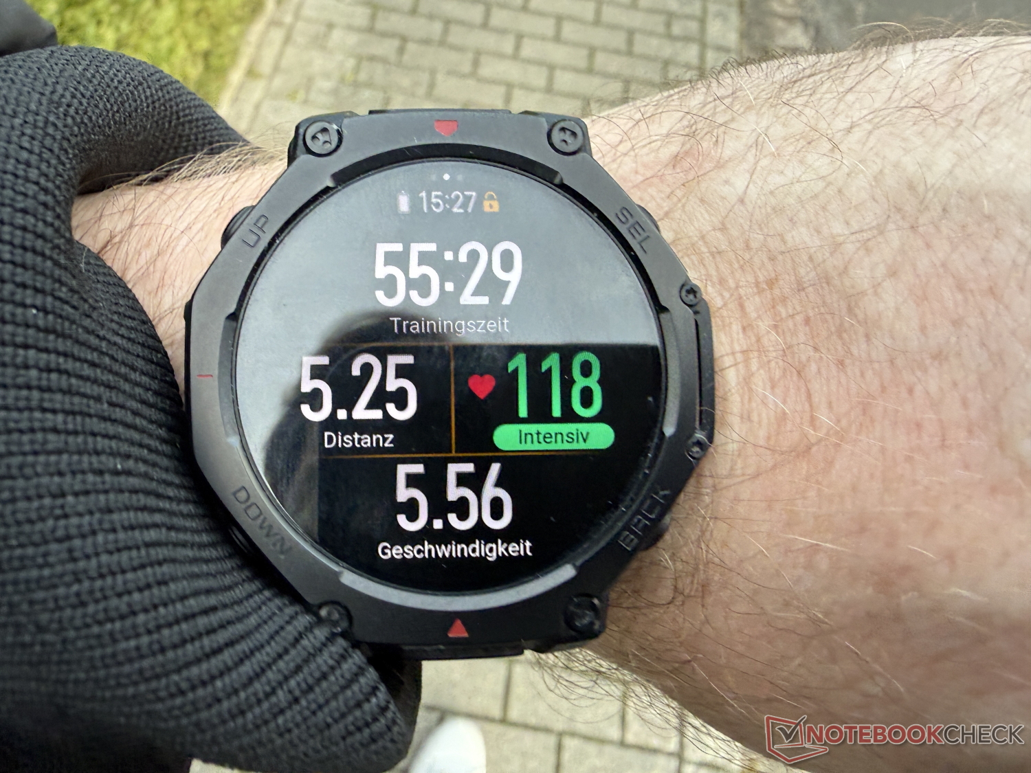 一如既往,续航时间取决于各种设置和使用强度。在测试期间,我们通常每 5 分钟启动一次自动心率监测和其他健康跟踪功能。显示屏亮度自动调节,8 秒后屏幕关闭。在这些设置下,Amazfit 3 Pro 仅在偶尔使用不带 GPS 的运动跟踪功能时,一次充电可持续使用两周左右。