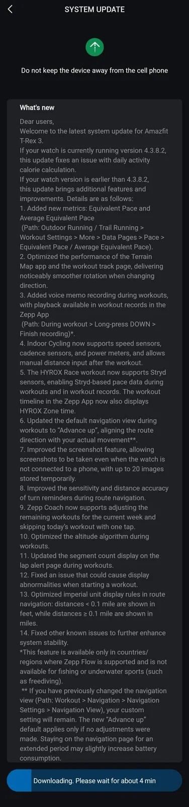 Amazfit T-Rex 3 智能手表用户现在可以在锻炼过程中录制语音备忘录,地形图和锻炼轨迹页面也都得到了改进。下面是软件 4.3.8.4 版的完整变更日志。目前还不清楚新更新何时完成。您可以通过 Zepp 应用程序安装 Amazfit T-Rex 3(目前亚马逊售价 249.99 美元)的更新。