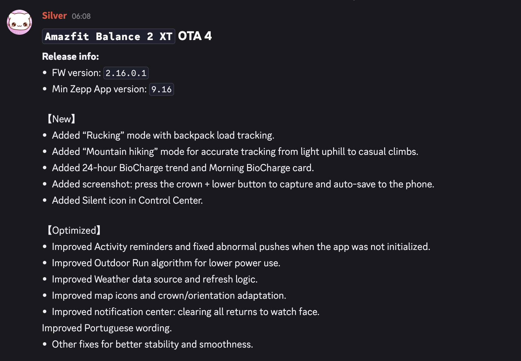 最新更新在Zepp Health Discord 上发布。中公布,最新更新被称为 Amazfit Balance 2 XT OTA 4 版本,或固件版本 2.16.0.1。它为这款智能手表带来了一系列新功能,包括两种新的锻炼模式:Rucking 和 Mountain Hiking。还有两个与 BioCharge 能量监测相关的工具:24 小时 BioCharge 趋势和晨间 BioCharge 卡。