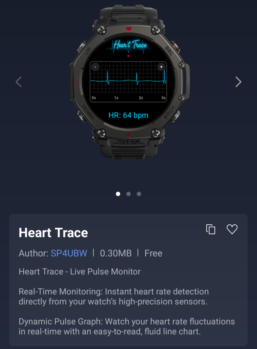 三个迷你应用程序中最受欢迎的是Heart Trace,目前在Zepp OS每周下载应用程序排行榜前50名中排名第二。这是一款实时脉搏监测器,允许用户实时查看智能手表收集的心率数据。测量结果显示在动态脉搏图上,开发者称其为 "易读、流畅的线形图"。