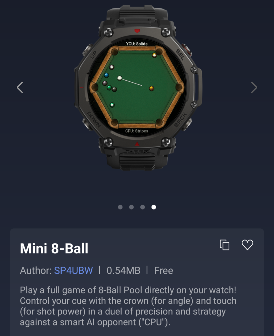Amazfit 可穿戴设备用户还可以玩两款新游戏。第一款是迷你 8 球游戏,您可以在手表上与人工智能生成的玩家进行 8 球桌球比赛。台球杆的角度可以通过智能手表的表冠来调节,而力量则由触摸输入来控制。第二款是 Quick Math,这是一款脑力训练应用,用户在固定时间内解方程即可获得分数。