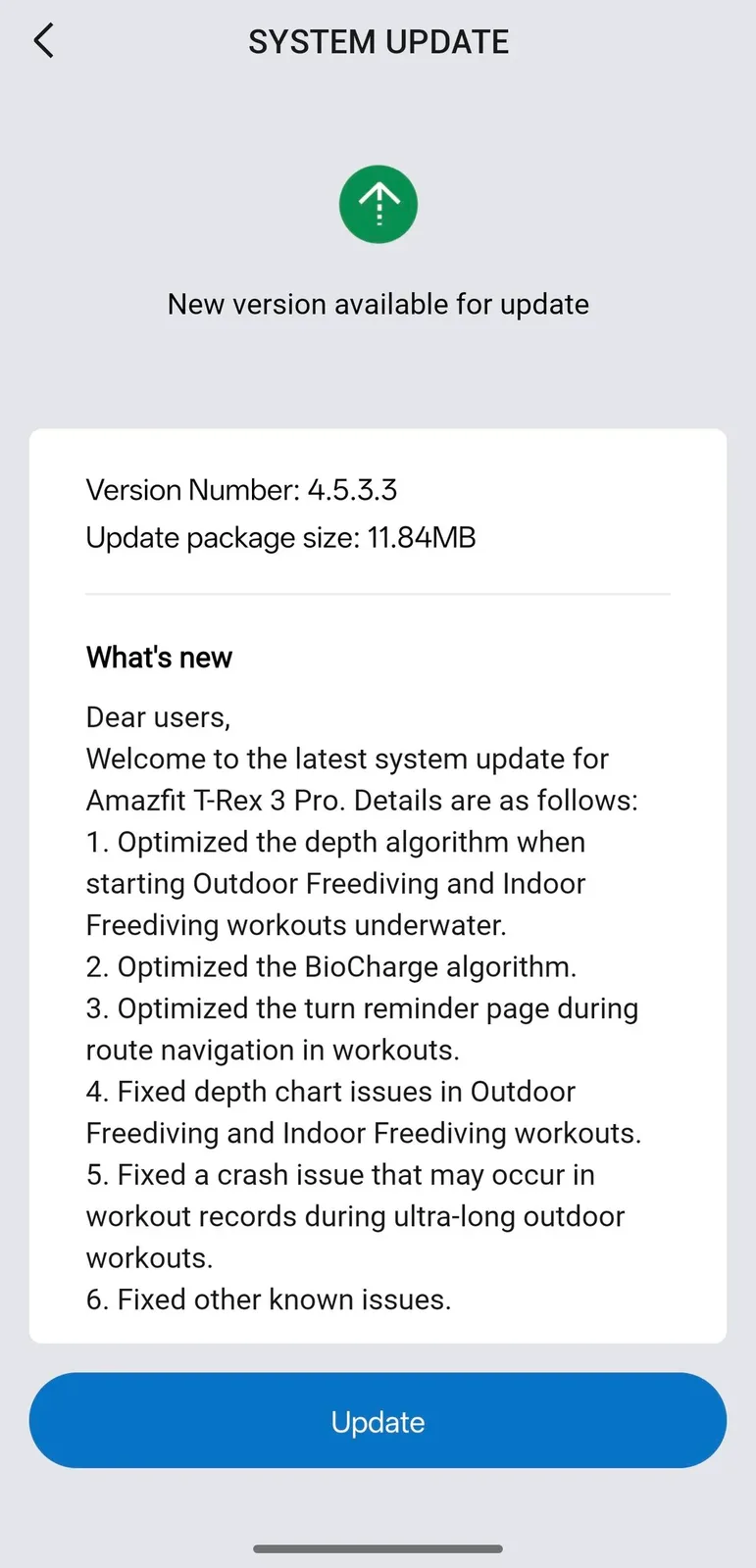 Amazfit T-Rex 3 Pro 智能手表用户在 Reddit 上报告了软件 4.5.3.3 版本。.据说这个 11.84MB 的文件对深度算法进行了优化,与户外自由潜水和室内自由潜水训练相关联。据说还对转弯提醒页面进行了改进,该页面会在用户使用路线导航功能锻炼时提供给用户。此外,Zepp Health 还表示已增强了生物充电算法,但并未量化用户的受益程度。