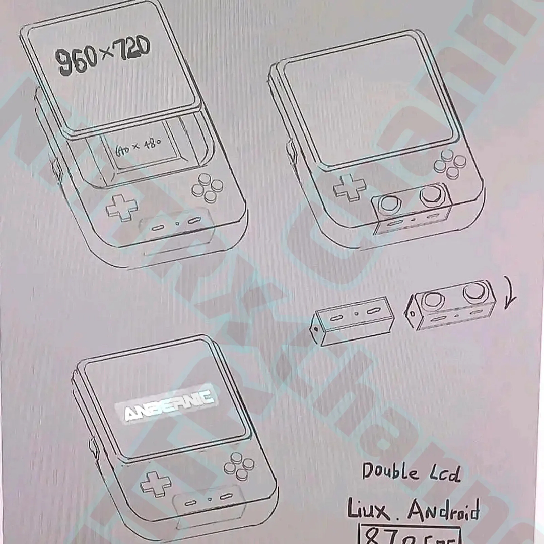 据称,Anbernic 正在开发一款带有两个显示屏的游戏掌机,其中较大的显示屏可以向上滑动,露出较小的显示屏。如下图所示,这两块显示屏的输出像素分别为 960 x 720 和 640 x 480,长宽比均为 4:3。此外,该设备还配备了一组常用的操作按钮和一个大小适中的 d-pad。