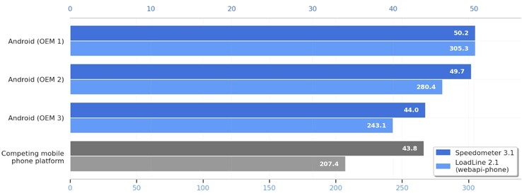Speedometer 是Apple 、谷歌和 Mozilla 的一个联合项目,它模拟点击按钮浏览和滚动等常见的用户任务,以衡量浏览器的 "迅捷 "程度。谷歌分享的基准测试结果显示,未命名的Android 旗舰手机超过了 "竞争手机平台"(读作:iOS)的最新手机。