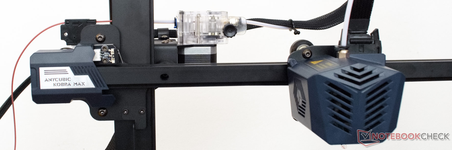 一个BMG式挤出机和一个Volcano热端在Anycubic Kobra Max上做得很好。大约45厘米(1.5英尺)长的PTFE管道向设备输送长丝,在我们的打印结果中几乎看不出来。对于双齿轮挤出机来说,这是很常见的,每次缩回时都能听到呼啸的声音。该模型的打印头和整体结构与Anycubic Viper上的打印头和整体结构没有明显区别,而且这里还实施了相当不寻常的自动床身找平过程。当把打印头的喷嘴降到各个接触点上时,一个负载传感器决定了时间。然而,在Kobra上值得注意的是,与指定参数有轻微的偏差。这是由于X轴和打印床的灵活性有点高。X轴的这种灵活性在打印床的边缘不太明显,而在打印床的中心则达到最高。这导致ABL传感器接收到一个马鞍形的变形。然而,在我们相当短的测试期间,除了在第一层的各自区域有少量过度和不足的挤压外,我们没有发现任何问题。打印头还配备了一个小的LED灯和两个径向风扇,它们被安置在热端和称重传感器旁边。