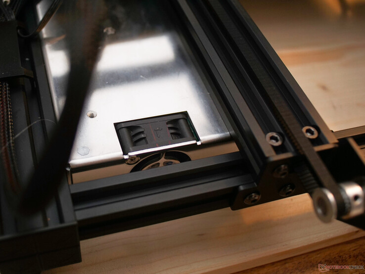 两个摆锤式稳定器为该装置提供了亟需的稳定性。正如目前的3D打印机通常的情况一样,它的运动部件在V型槽铝挤压件和D型滚轮的组合上运行。这种相当僵硬的配置解决方案显示出其局限性,这是一些型材长度的直接结果。虽然基地中不乏40毫米×40毫米(19/16英寸×19/16英寸)的型材,但用于打印头的20毫米(13/16 英寸)2020铝挤压件似乎不适当地灵活。
