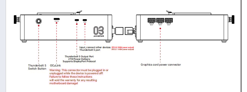 新款 eGPU 底座的另一个显著特点是通过内置 PSU 提供最大 GPU 功率。 内置 PSU.作为参考,Aoostar AG03 内置 800 W 电源,但最多只能为所连接的台式机 GPU 提供 500 W 的电力。