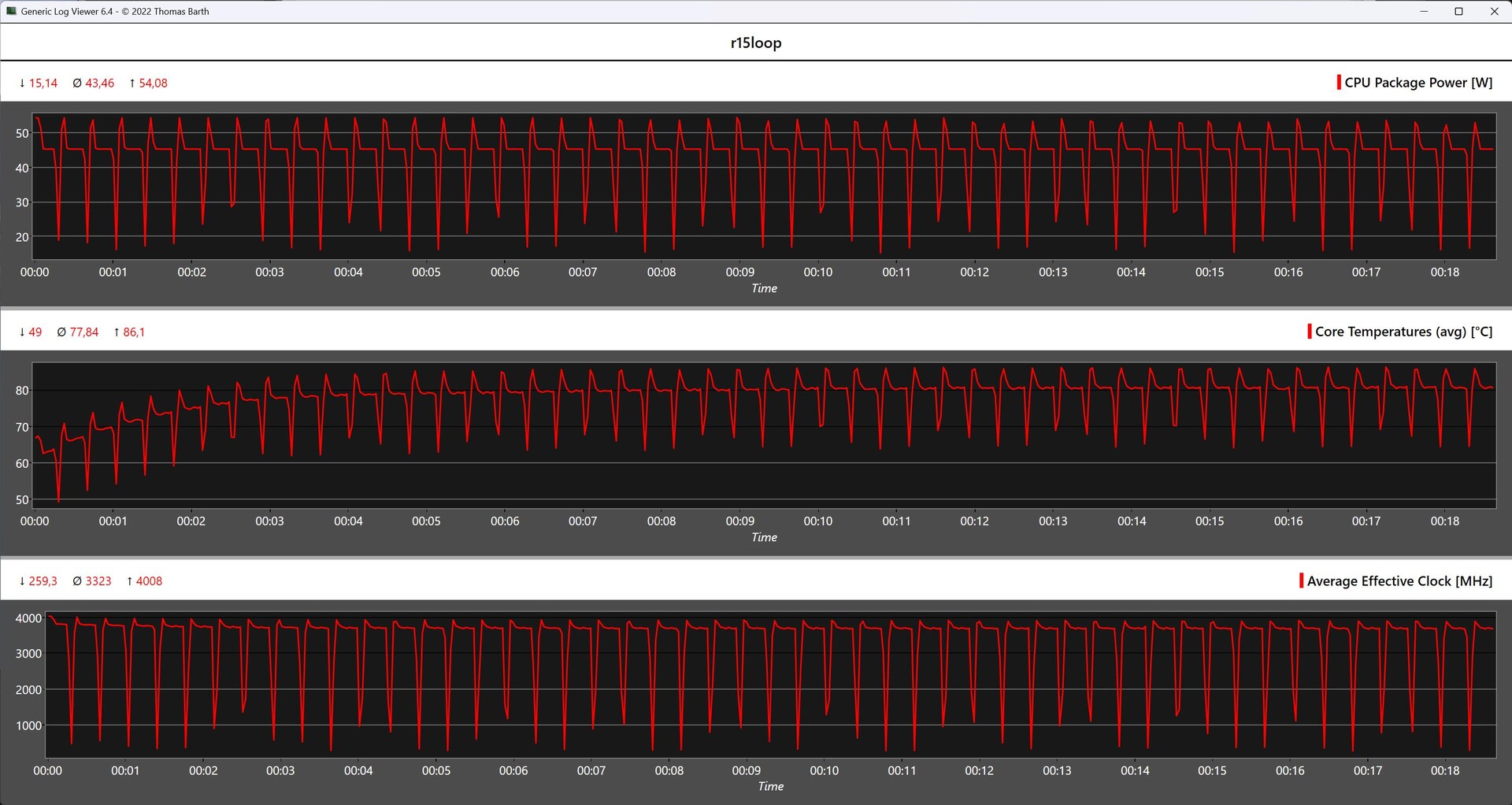 Cinebench R15 连续循环是对冷却装置的真正挑战。监测数据显示 AMD Ryzen 7 7735HS仅在很短的时间内达到 54 瓦的最大功率。在较长时间内,功率必须节流到 43 瓦左右。不过,在 86.1 °C 的温度下,SoC 尚未达到临界温度范围。与竞争对手相比,Aoostar GOD77 再次稳居第二。处理器的稳定性能值得肯定。