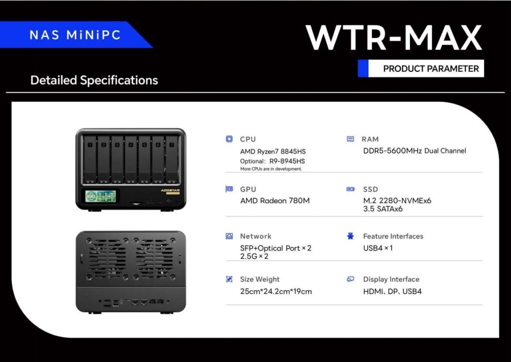 Aoostar 在中国推出了一款新的 NAS--WTR Max。与 WTR Pro 和 WTR Max 相比,WTR Max 的核心部件更大、功能更强。 WTR Pro相比,WTR Max 是一款更大、功能更强的机型。而更新的配置则搭载了 AMD Ryzen 7 8845HS,并配备了 Radeon 780M iGPU。还有第二种配置,即 Ryzen 9 8945HS。