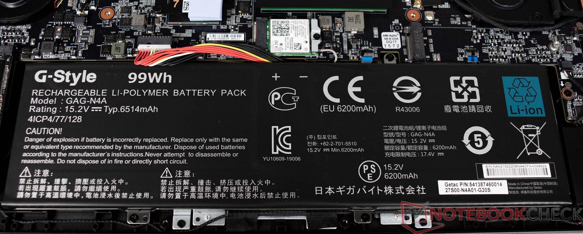 Aorus 17X AZF配备了一个99Wh的大电池,这也是笔记本电脑中的最大值。几乎所有的对比设备都提供相同容量的电池。只有惠普Omen 17不得不使用较小的83Wh电池,因此明显落后。