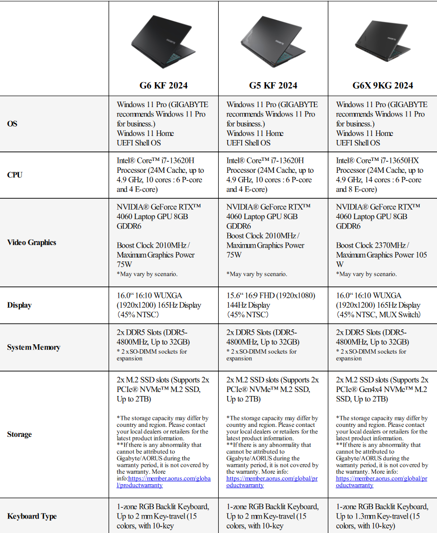 技嘉 Aorus G6X 与 Aorus G6/G5 的主要区别在于 CPU 的选择。G6X 采用英特尔 酷睿 i7-13650HX而 G6 和 G5 则采用了 酷睿 i7-13620H.三款机型的 GPU 选择仅限于GeForce RTX 4060 和 RTX 4050。同样,它们最高支持 32 GB DDR5 4,800 内存和 2 TB NVMe SSD。