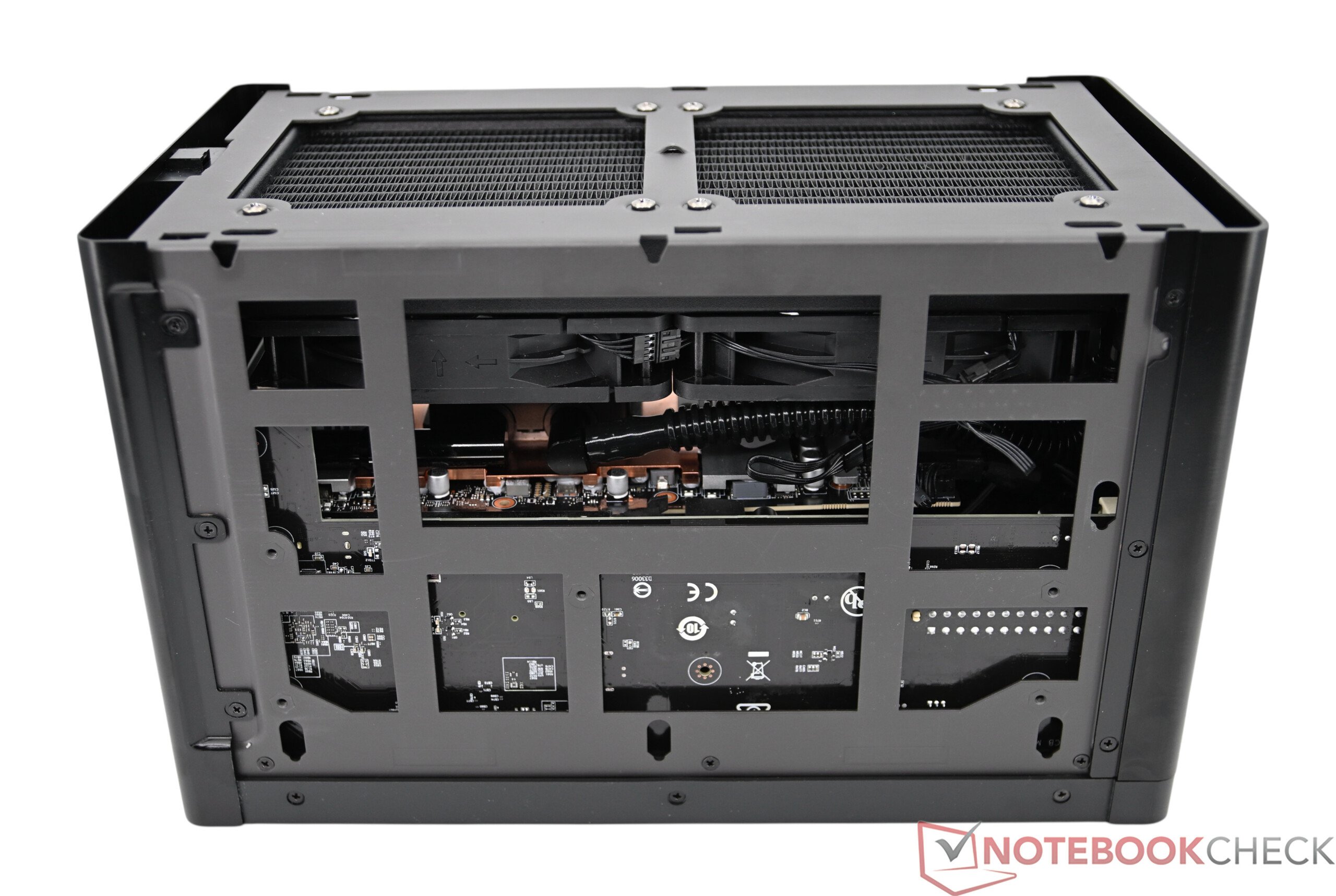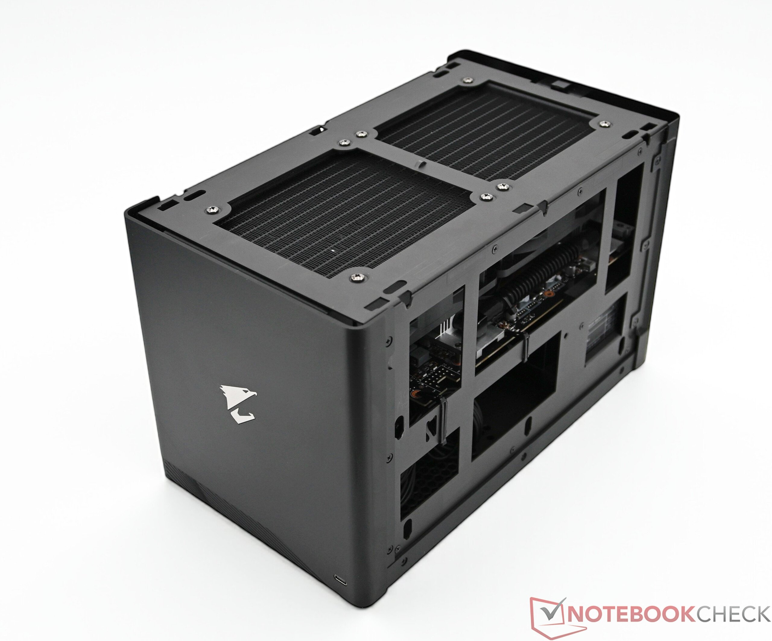 技嘉在 Aorus RTX 5090 AI Box 中集成了GeForce RTX 5090、强大的 AiO 冷却系统和 850 瓦电源装置,外壳特别紧凑、稳定。它主要由金属制成,确保了高度的坚固性和高品质的外观。盖子和侧板无需工具即可拆卸,侧板还配备了防尘滤网,即使在关闭状态下也能轻松拉出。如果需要,还可以进一步拆卸外壳和安装的组件。在做工方面,几乎无可挑剔。从外观上看,机箱正面的 AORUS 发光标志非常醒目,其效果可通过技嘉控制中心进行调整,或根据需要完全关闭。唯一的缺点是金属表面很快就会留下指纹。