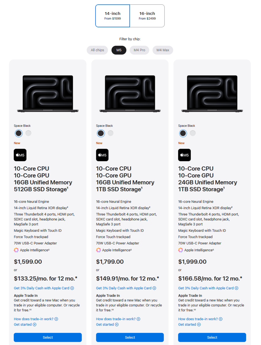 如前所述,16GB/512GB 版本的售价为 1599.99 美元,16GB/1TB 版本的售价为 1799.99 美元,最大 24GB/1TB 版本的零售价为 1999.99 美元。