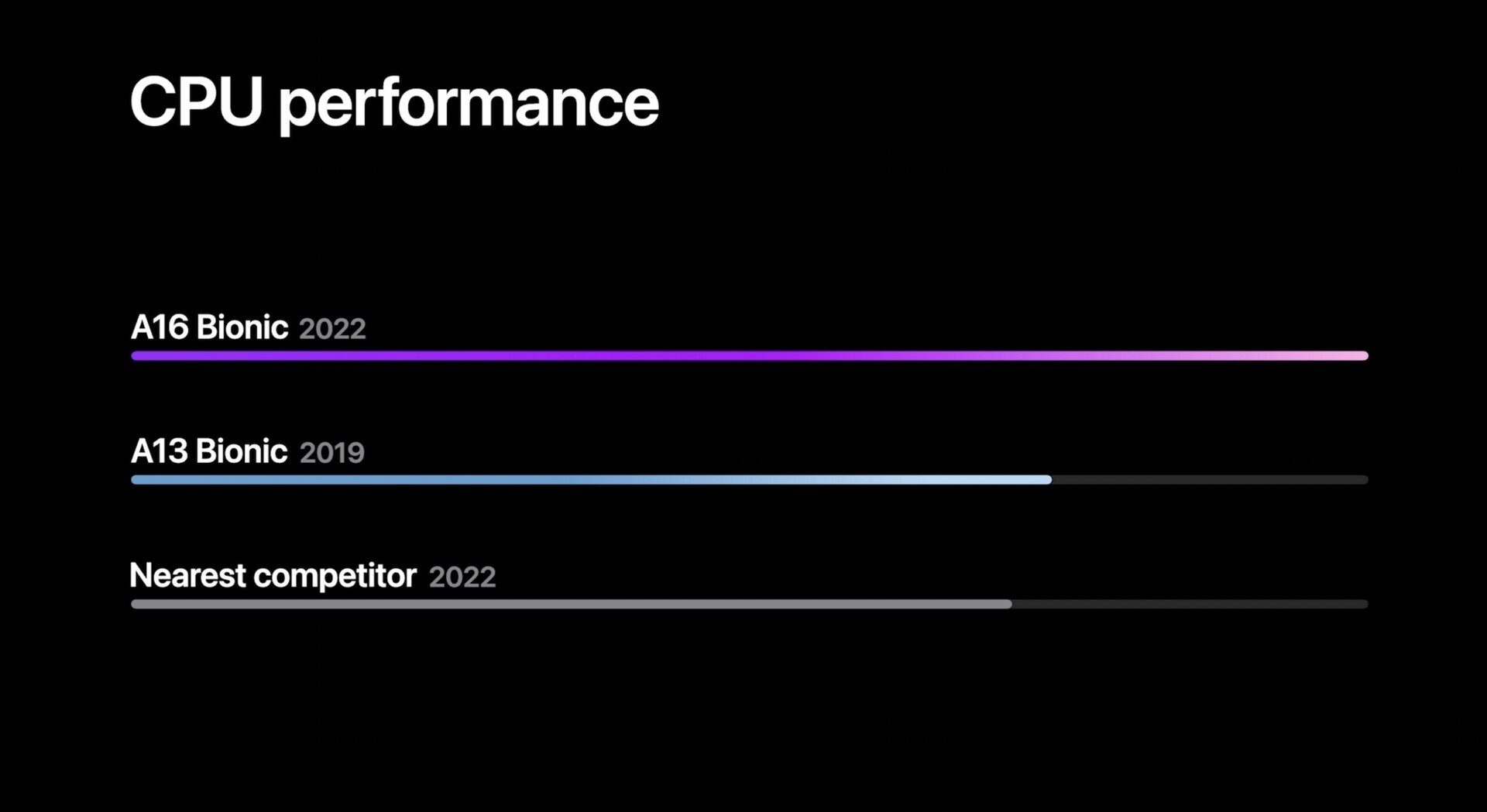 由于未知的原因,A16仿生芯片与三年前的A13仿生芯片而不是较新的型号进行了比较。Apple ,这是很有名的 欺骗性的比较而这种故意混淆视听的做法很可能是为了掩盖一代比一代低的性能改进。