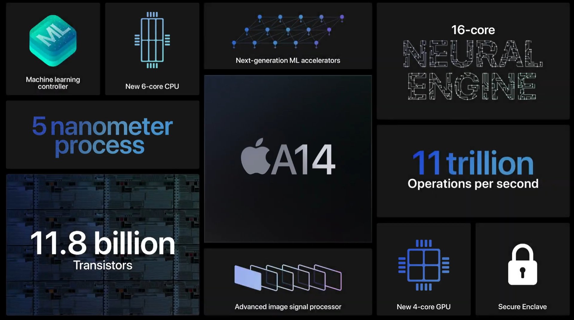 Apple A14 Bionic是iPhone 12和iPad Air(2020)型号中可见的苹果芯片上的系统。 2020年末发布,提供6个核心,分为2个性能核心(Firestorm)和4个能效核心(Isstorm)。 Apple表示,A14的CPU性能比iPad Air 2019的旧A12高出40%。 与Apple A13相比,这只能带来20%左右的收益。 A14内置了最高可达11个TOPS的快速4核GPU和16核神经引擎。 内存控制器支持LPDR4X,芯片正上方有4GB或6GB(软件包上的Package-PoP)。