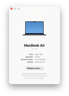 | Apple MacBook Air 13 M5 Apple M5 10-Core ⎘ Apple M5 GPU ⎘ 16 GB Memory, 512 GB SSD | Amazon: 1. $12.99 MOSISO Compatible with MacBo... 2. $25.99 Soonjet Matte Case for MacBo... 3. $285.99 Apple MacBook Air (13-inch R... List Price: 1199€ | 1.2 kg | 11.3 mm | 13.60" 2560x1664 225 PPI IPS | |