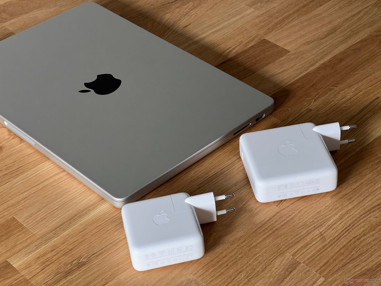 我们检查了使用标准 70W 电源适配器和选配的 96W 电源适配器的充电时间(设备已打开),但可以看出两者的差别并不大。两个适配器的完全充电时间都不到两小时,因此选配的 96 瓦适配器对 MBP 14 M3 来说意义不大。