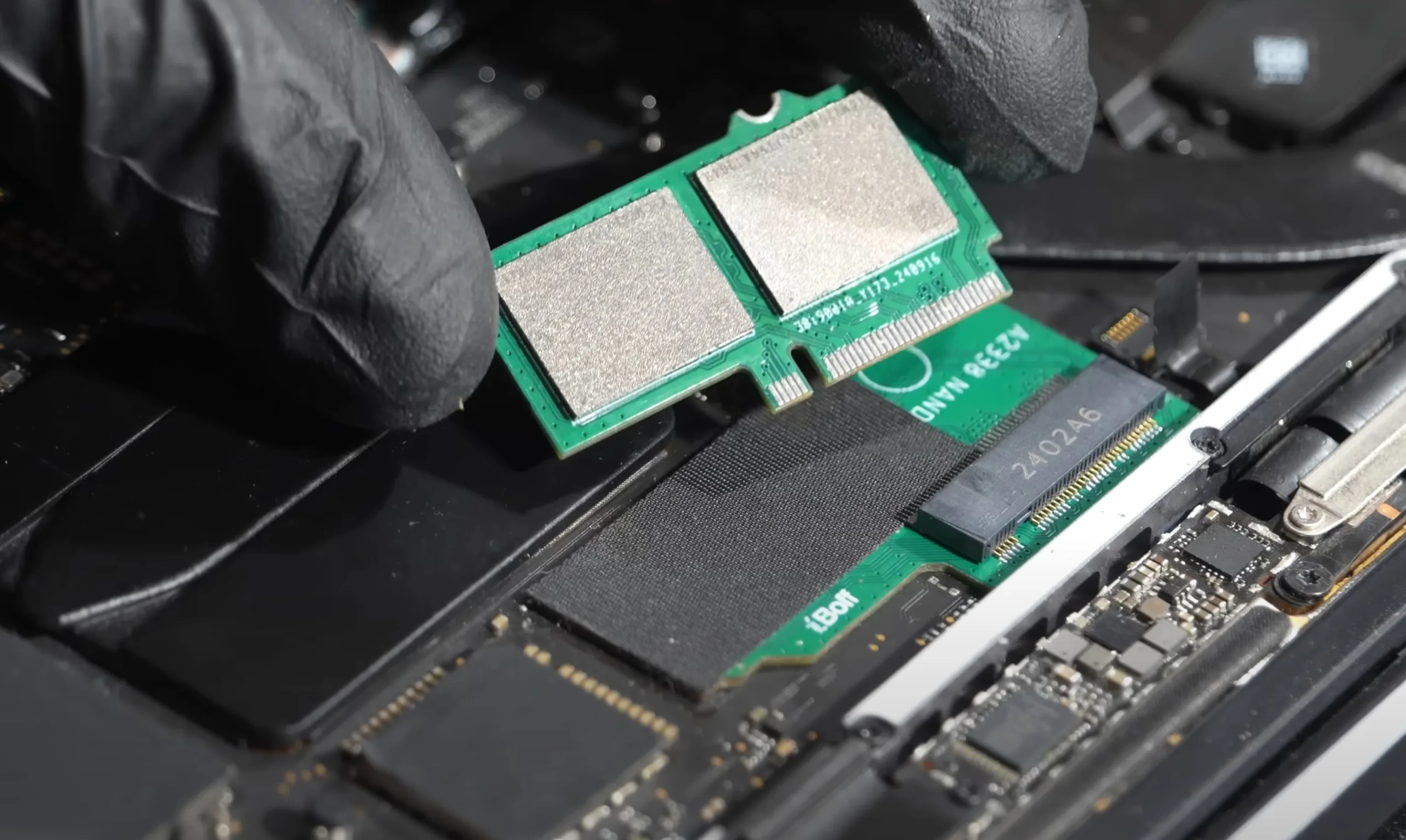 这位 YouTuber 和Apple 技术人员并没有解释是如何实现这一壮举的,但这已经不是 iBoff 第一次处理类似项目了,这家公司销售各种用于老一代 MacBook 和 iBoff 的分离板。该公司销售用于老一代 MacBook 和 iMac 的各种分离板。根据视频描述,iBoff 还计划将此项目转化为产品,在其网上商店出售。从视频中可以看出,MacBook 中原有的 NAND 被从主板上拆卸下来,取而代之的是一个带有一些基本逻辑组件的 M.2 插槽,这很可能是为了欺骗 MacBook 的 SoC 来识别新的固态硬盘,尽管它的尺寸已经升级。