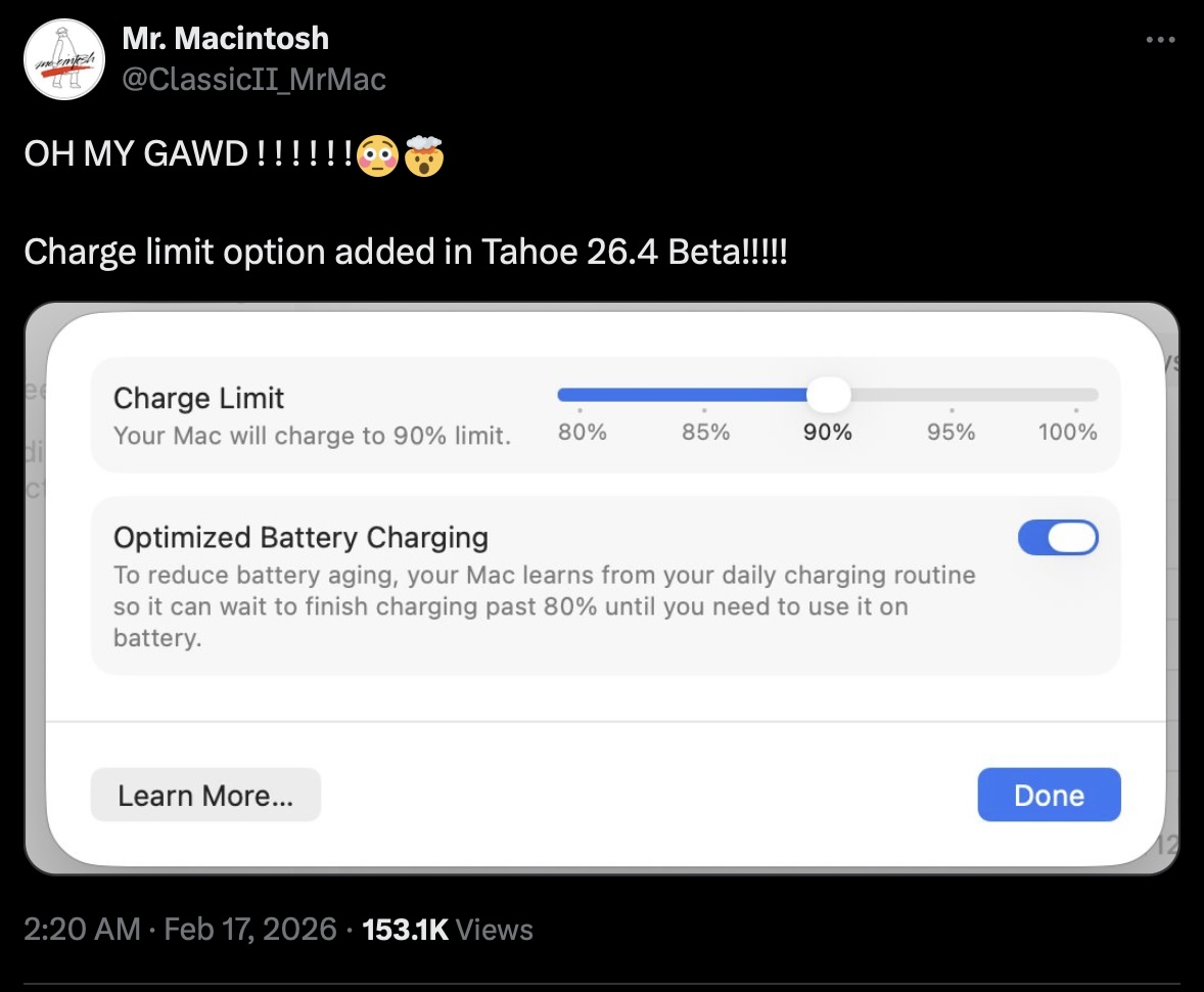 通过最新的macOS Tahoe 26.4 Beta 版Apple 似乎为 AlDente 等应用掘好了坟墓。MacBook 用户首次可以在系统设置应用中执行充电限制,不过最低值被锁定在 80%。不管出于什么原因,那些想要更低值的用户仍不得不选择第三方解决方案。