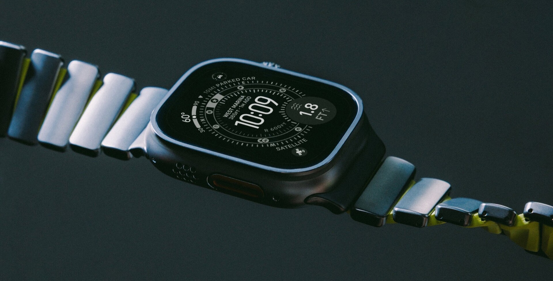 Apple Watch Ultra 的 Nomad Stratos 表带在制造商的网上商店有售,,售价 179 美元。.价格包含所有税费,免运费。腕带本身有黑色和银色两种,均有黑色、橙色或 "Volt"(绿色)装饰可供选择。