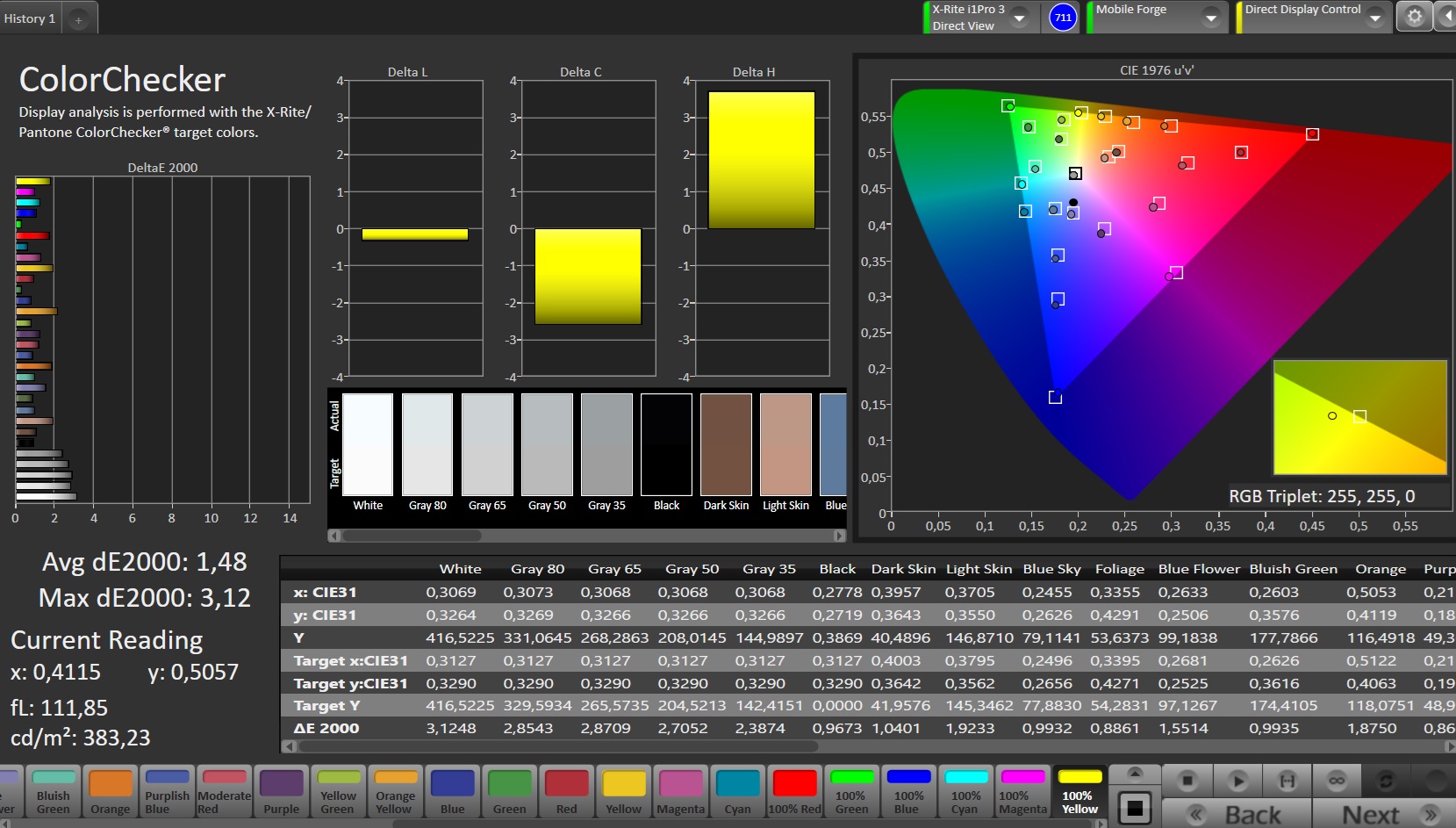 | Colorchecker dE 2000 max. * | 3.12 | 2.45 21% | 3.67 -18% | 4.6 -47% | 2.6 17% |