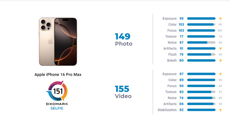 iPhone 16 Pro Max 在 DxOMark 的自拍排名中稳居榜首。它的自拍总得分为 151 分,与Honor Magic 6 Pro 相同,比高。谷歌 Pixel 9 Pro XL。该团队指出,这款Apple 旗舰机的前置摄像头可以提供宽动态范围和准确的拍摄曝光。