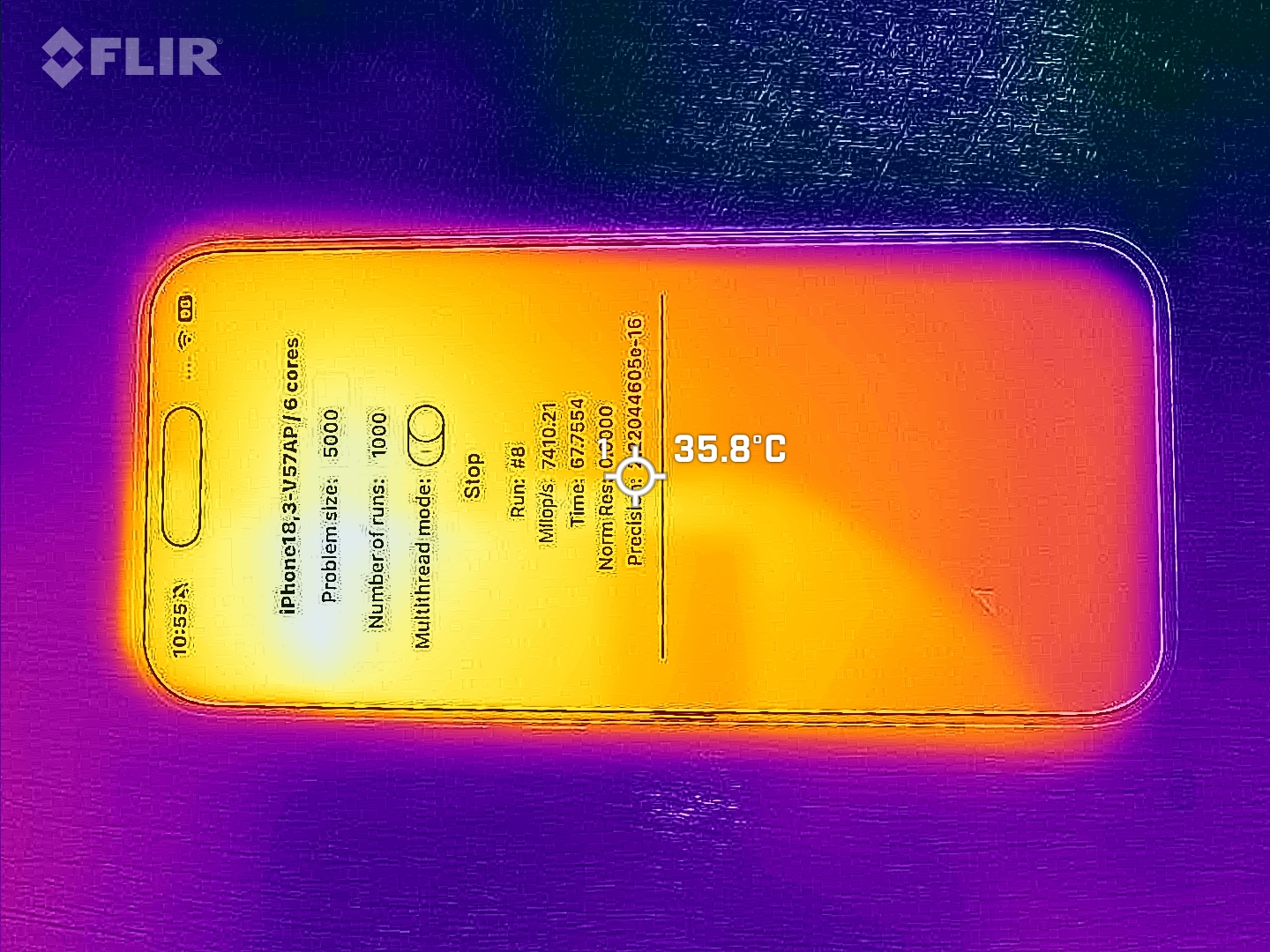 iPhone 17 的表面温度高达 43.3 °C,与 iPhone 16 相比,在负载情况下仍能保持较低的温度。 iPhone 16.不过,在 3DMark 压力测试中,测试设备的最高性能下降了三分之一。在这方面,iPhone 16 的效率还是略胜一筹。