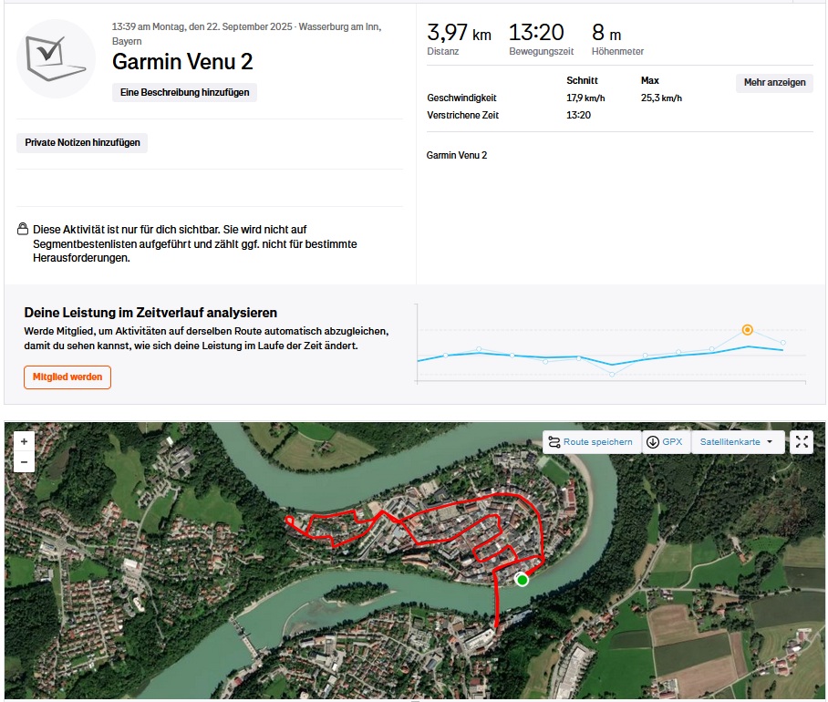 iPhone 17 使用双频 GPS、GLONASS、Galileo、QZSS、北斗和 NavIC 卫星导航服务来确定其位置。正如我们的短途自行车之旅所示,这款智能手机非常适合用于导航。与 Garmin Venu 2 健身智能手表相比,iPhone 17 在某些路段会有轻微误差,但总体上可以忽略不计。