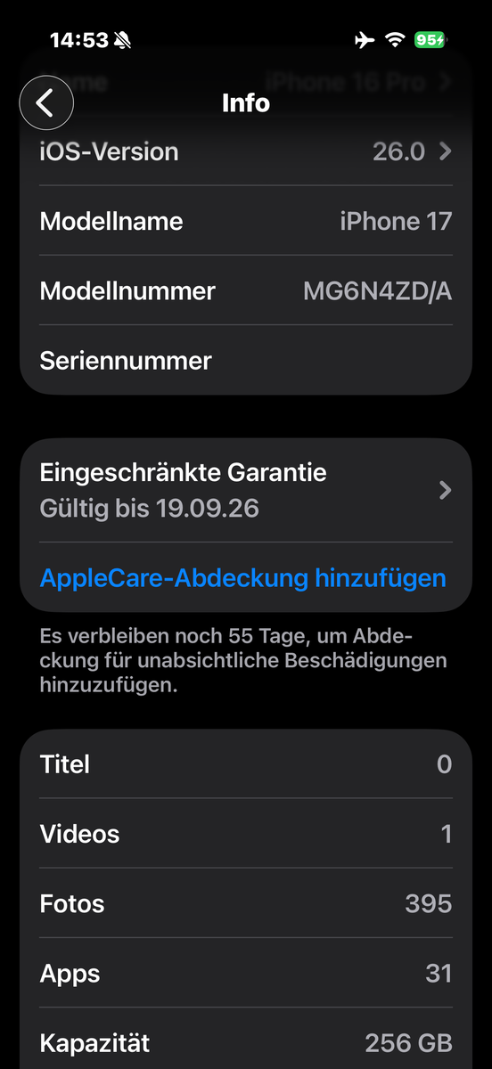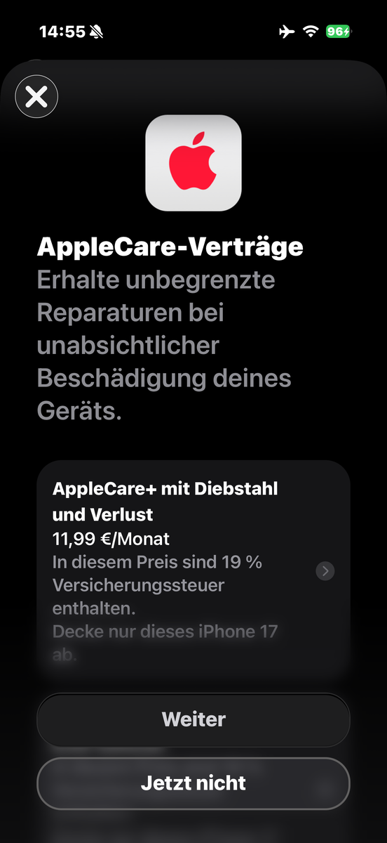iPhone 17 提供 12 个月的保修服务,保修期从Apple 开始。可通过AppleCare+ 延长保修期。该服务涵盖意外损坏情况下的维修(有免赔额)。被盗或遗失也可选择保修。