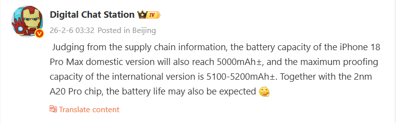 根据供应链提供的信息,中国泄密者 Digital Chat Station 刚刚首次披露了有关Apple 计划在今年晚些时候推出的 iPhone 18 Pro Max 的电池容量的具体细节。据此,iPhone 18 Pro Max 将再次有两种不同的型号:一种是只有 eSIM 卡的型号,电池容量约为 5,100 mAh 至 5,200 mAh;另一种是有 nano-SIM 卡插槽的经典型号,电池容量为 5,000 mAh。