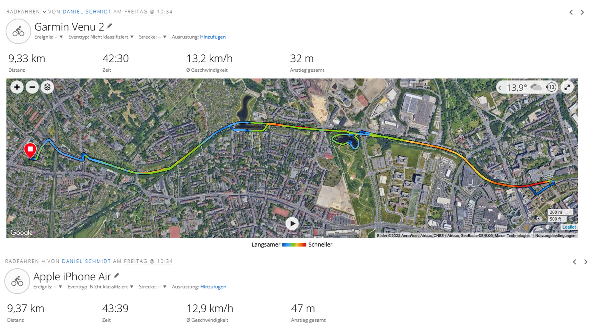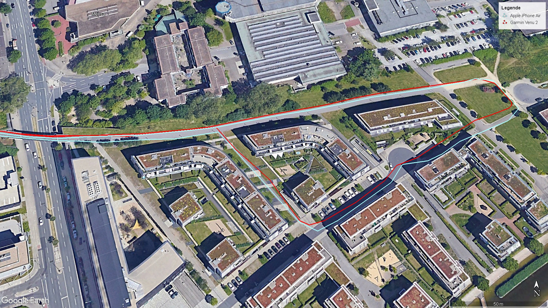 iPhone Air 使用双频全球导航卫星系统(GNSS)与所有主要卫星网络连接来确定自己的位置。位置跟踪速度相当快,但在骑车的实际测试中,智能手机检索位置的时间间隔明显较长,这意味着路线跟踪并不总是准确的。不过,它仍然完全能够满足导航目的。