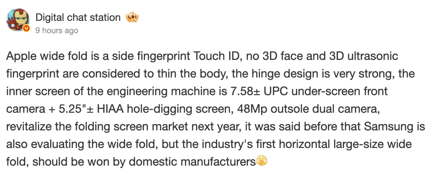 iPhone Fold 离发布可能还有近一年的时间。尽管如此,Digital Chat Station 还是提前获得了有关该设备的新信息。