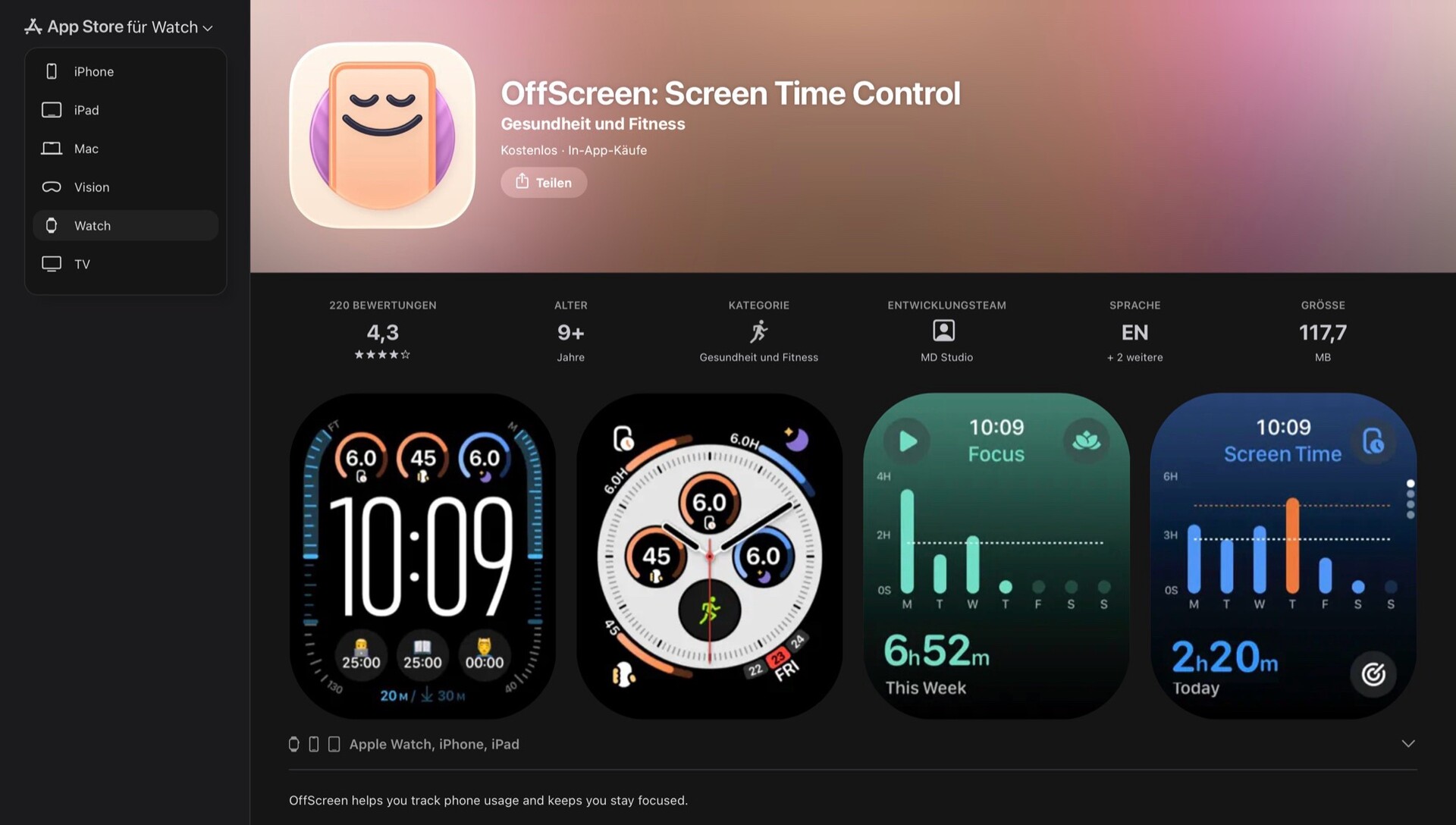 屏幕左上角的按钮可让您在所有Apple 平台之间快速切换,方便您在购买相应产品之前浏览Apple Watch、Apple TV 4K或Apple Vision Pro 的可用软件。