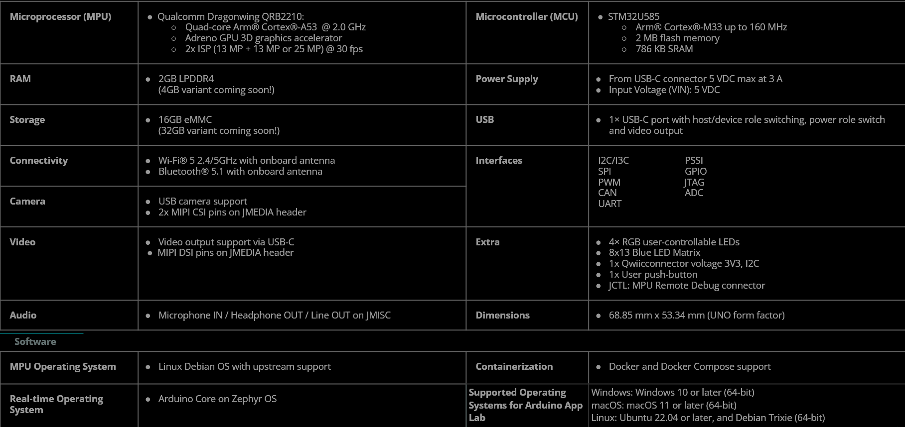 最初推出的 Arduino UNO Q 将配备 2 GB 内存和 32 GB eMMC 存储器。配备 4GB 内存和 64GB 存储空间的变体也将很快推出。默认情况下,USB-C 端口可以兼作摄像头输入和视频输出,但也可以使用专用引脚来释放端口。另一方面,麦克风始终需要使用一个引脚。