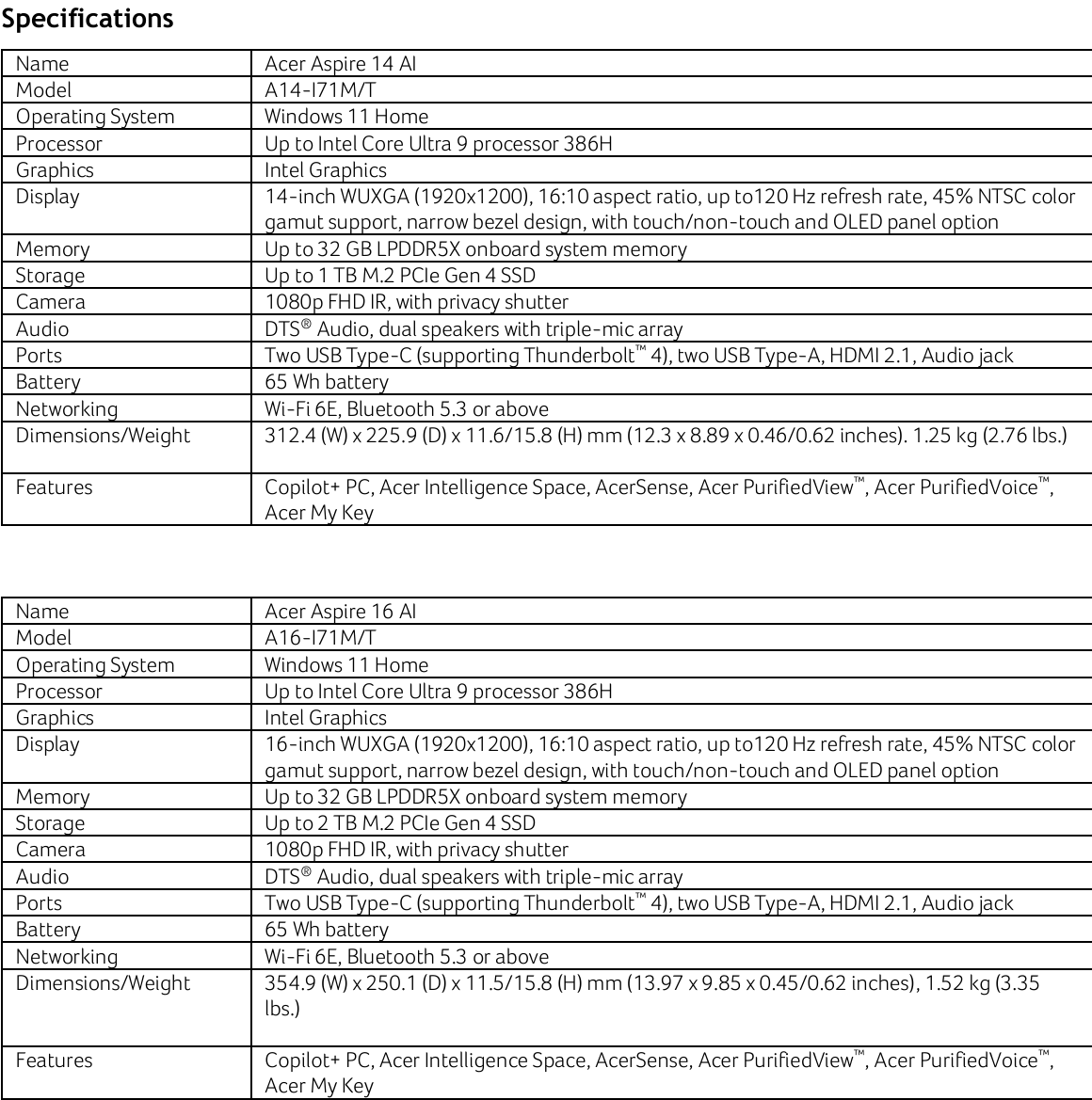 Aspire 14 AI 和 Aspire 16 AI 是 Copilot+ PC,搭载了 英特尔酷睿 Ultra 9 386H最高可配备 32 GB LPDDR5x 内存和 2 TB M.2 NVMe 固态硬盘。