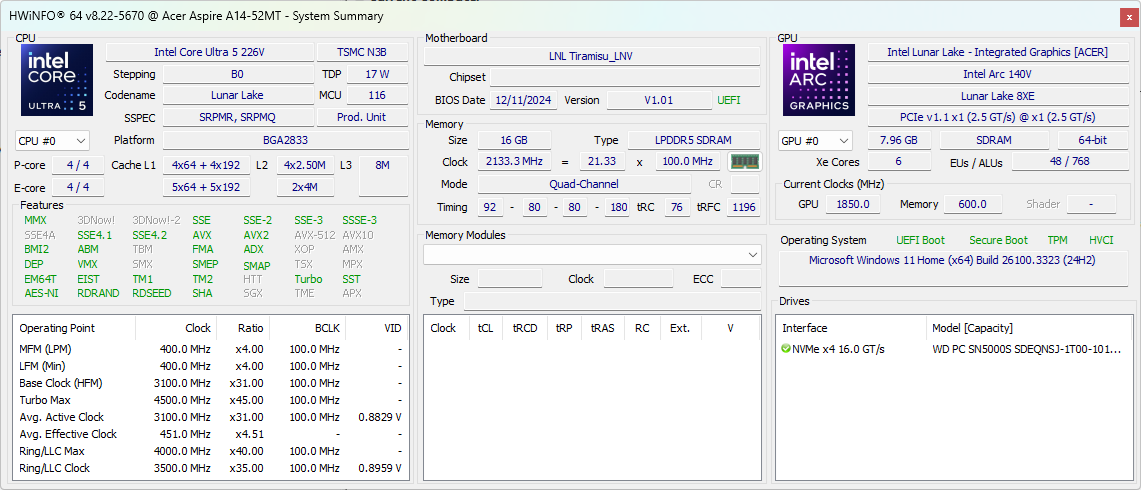 | Acer Aspire 14 AI N24Q14 Intel Core Ultra 5 226V ⎘ Intel Arc Graphics 130V ⎘ 16 GB Memory, 1024 GB SSD | Amazon: 1. $109.00 New KrystalPix LCD Display F... 2. $91.68 Replacement LCD for Acer Asp... 3. $109.00 Replacement Screen for Acer ... List Price: 700 USD | 1.4 kg | 17 mm | 14.00" 1920x1200 162 PPI IPS | |