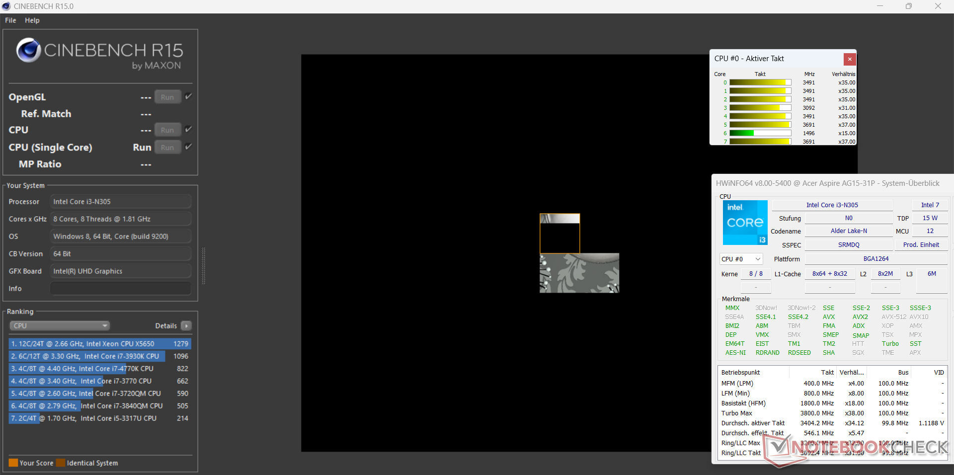 8 个 CPU 内核 酷睿 i3-N305(0P、8E;Alder Lake)的最高时钟频率为 3.8 GHz。连续多线程负载(CB15 循环)导致时钟频率从第一次运行到第二次运行时略有下降。之后,时钟频率保持稳定。基准值与 CPU 平均值相当。