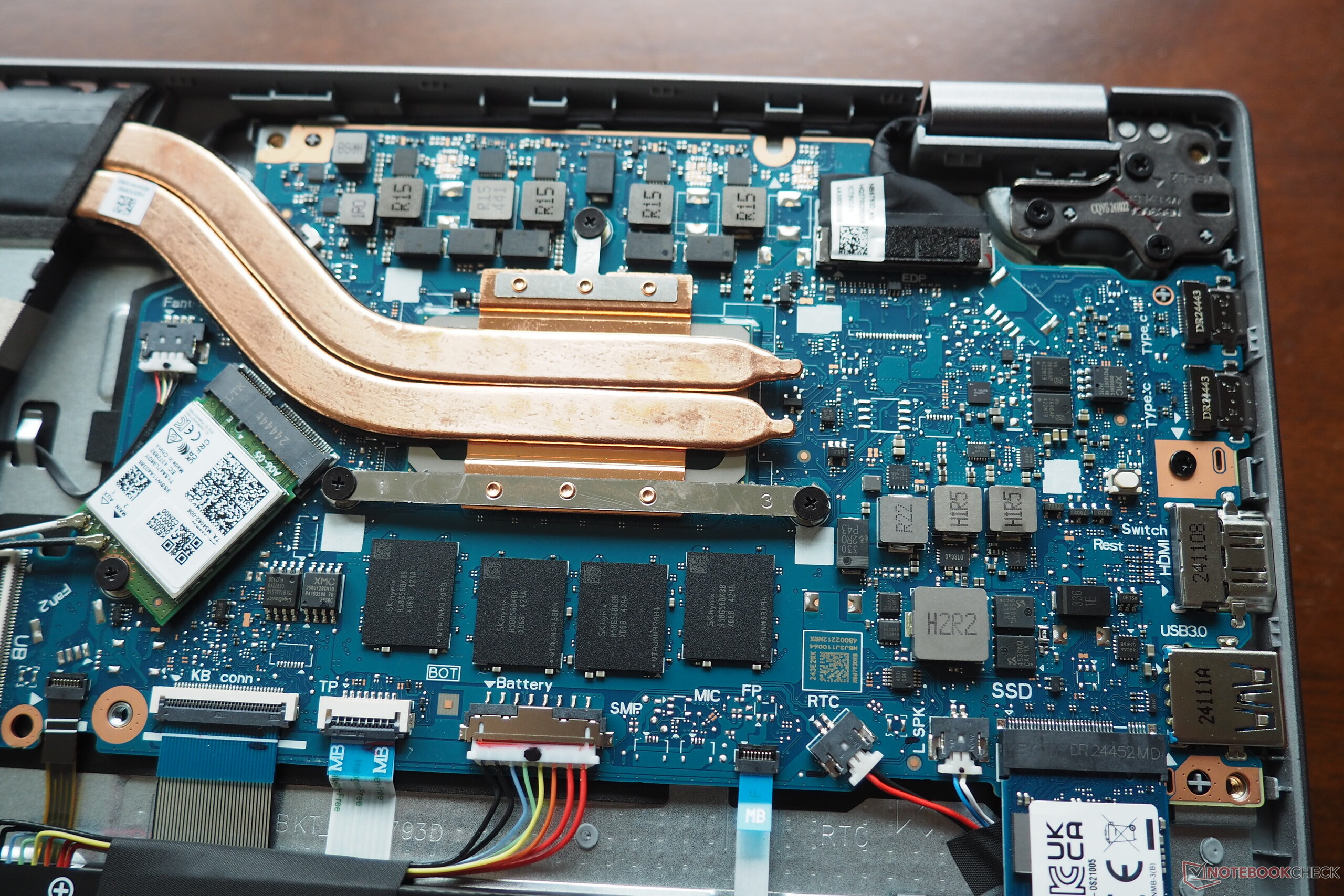 底板由 10 颗十字螺丝固定。引擎盖下是一块大电池,旁边只有一个 M.2 插槽。两根热管从风扇通向内置 CPU。Wi-Fi 模块位于两者之间。