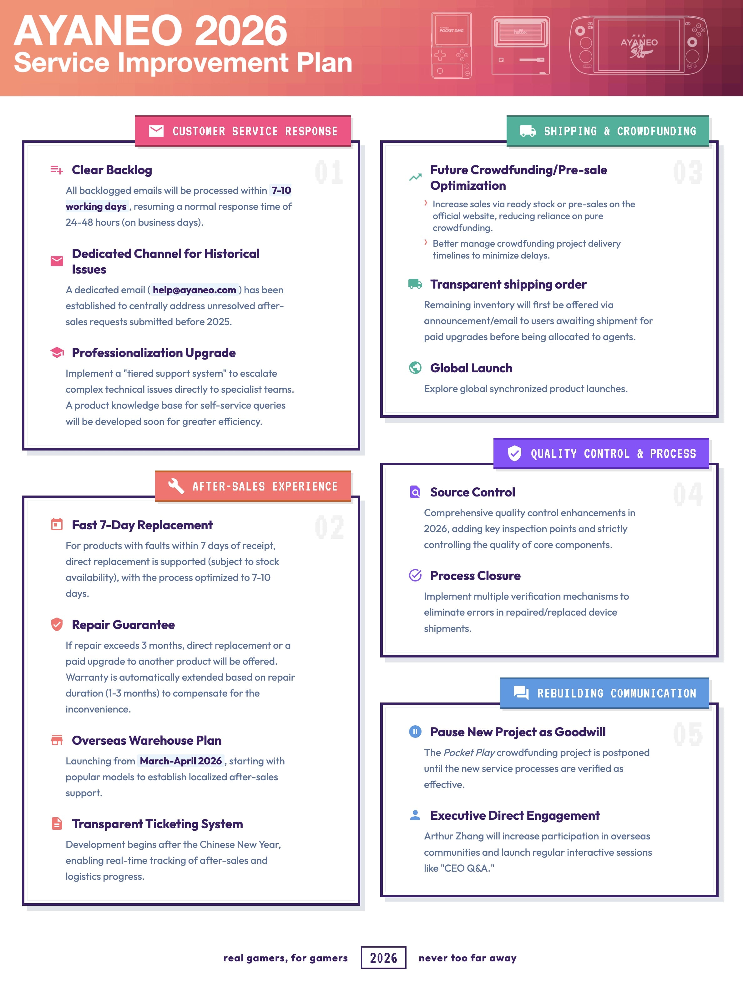 Ayaneo在其社交媒体渠道上发布的2026年服务改进计划涵盖五个主要方面--客户服务响应、售后体验、运输和众筹、质量控制和流程以及重建沟通。以下是改进计划中的一些关键细节: