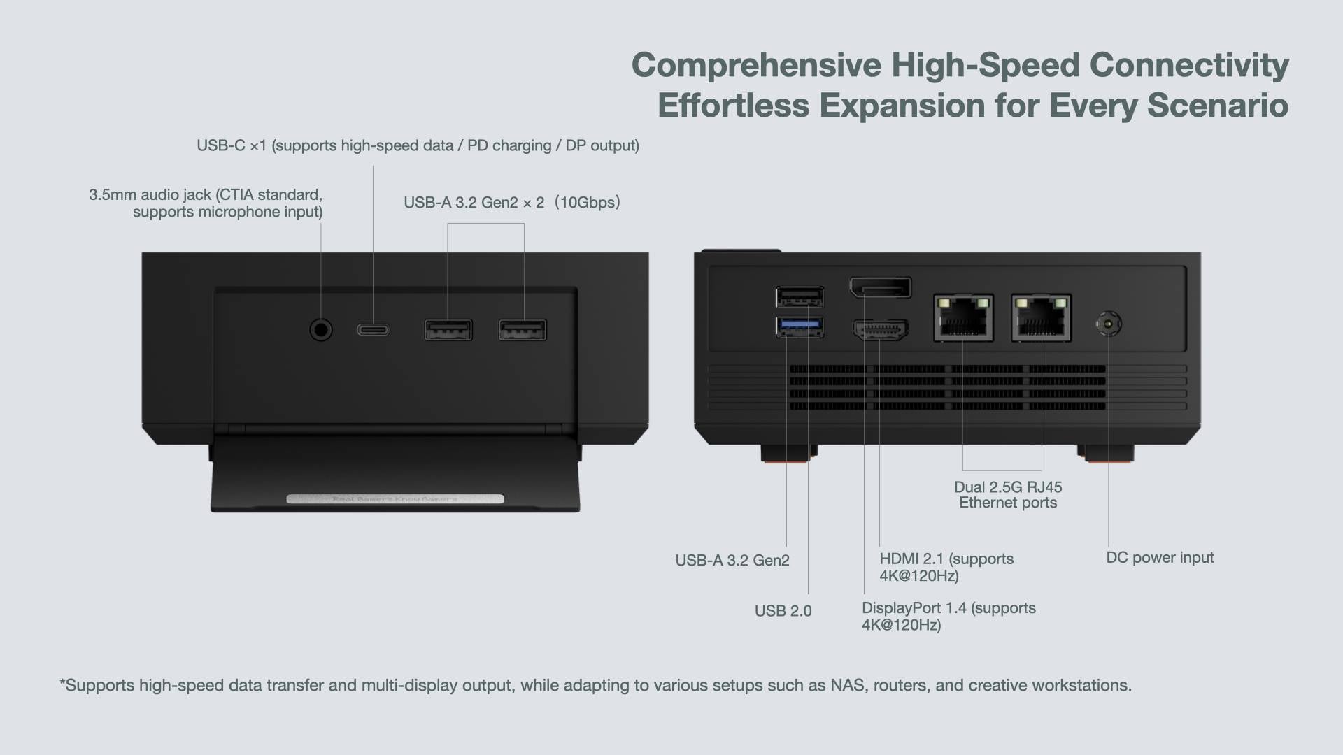 如下图所示,Ayaneo 还提供了大量端口,包括 DisplayPort 1.4、HDMI 2.1 和双 2.5 千兆以太网。Ayaneo AM03 的裸机起价为 399 美元,未安装任何内存或存储设备。另外,Ayaneo 还提供 16 GB 内存和 512 GB 存储空间的机型,售价为 499 美元。请访问公司网站了解更多详情。